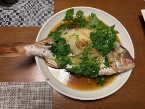 鯛は塩焼きではなく、娘が中華風の紹興酒で蒸して熱したごま油をかけた物になりました