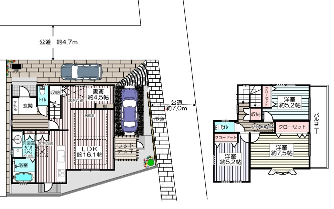 ■駐車2台可能(車種による)■前面公道幅員約7.0m×約4.7m